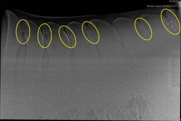Toto je RTG snímek páteře koně, který trpěl bolestmi zad, nicméně i přesto byl jezditelný, jen vykazoval diskomfort pod sedlem. Žlutě jsou zvýrazněna místa, kde pozorujeme důsledek kontaktu trnových výběžků obratlů k sobě navzájem. Vidíte, že postižená oblast je poměrně rozsáhlá.