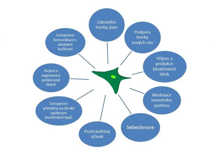 Kmenová buňka je prakticky náhradní díl pro poškozenou tkáň. Ve svém klidovém stadiu nemá žádné specifické vlastnosti ani funkce. V tomto stadiu se nachází například v kostní dřeni nebo tukové tkáni. V případě poškození nějaké tkáně v těle nastává její čas a ona putuje krevním oběhem do místa poranění, kde nahrazuje poničené buňky tím, že se do nich sama přemění. Dále se v místě poškození množí a produkuje tak další a další náhradní buňky. Navíc vylučuje různé látky, které napomáhají hojení a snižují zánět.