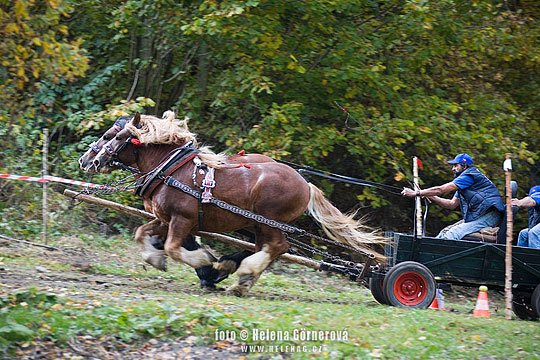 Po dekorování formanky prostřídalo koně pásmo lidových písní v podání Dětského folklórního souboru Lykovček z Revúce a koně se připravili k „práci s drevom“. Trať nebyla vyloženě náročná, ale své záludnosti v několikerém shazování míčků z kuželů (a tedy v míře couvání) měla. S kmenem bylo třeba také dvakrát překonat druhý kmen, fixovaný na zemi. Pro nás opravdu nezvyklou novinkou byl „pomocník“, který musel v Dobšiné provázet svého „kočiše“ přímo na trati. Zhusta jim však spíše překážel, proto čeští zástupci, uvyklí samostatné práci, tuto vymoženost většinou nevyužili a doprovod jen běhal po trati za nimi. Alespoň že na Slovensku zvítězil zdravý rozum a do pravidel „klády“ se dostalo doslovné „jízda bez biče“. Vítězem disciplíny se stal polský forman, pan Krysztof Gorzol s koňmi Gniady a Bartek, který měl sice problémy s vedením podsedního koně, ale nejrychlejší čas bez trestných bodů. Naši podali praxí nachozené, pěkné výkony a umístili se 3. – pan Sněhota, 6. – pan Košťál, 8. – Jan Blizňák (který ztratil cenné vteřiny při shazování míčku z kužele) a 13. – Milan Blizňák, který prošel trať s koňmi v bezchybném, ale velmi klidném tempu. Viditelně méně zkušení koně pana Drexlera byli bohužel opět vyloučeni v couvání. Náročnost trati ovšem pěkně zamíchala průběžným pořadím, a tak ještě na začátku těžkého tahu nebylo jasné, kdo získá další evropské zlato…