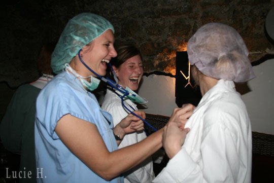 Typickou výbavou na párty byl zelený obleček, bílý plášť či župan pro pacienta. Podle našich informací se sháněly kostýmy všude. Někdo ho měl od známých, někdo přímo z nemocnice a někdo přímo ze sexshopu.