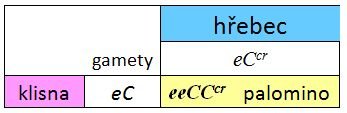 Pokud ale zúžíme výběr a připustíme například klisnu ryzku (genotyp eeCC) hřebcem cremello (eeCcrCcr) získáme vždy potomky palomino! Viz následující tabulka. V tomto případě pro zjednodušení tabulky zanedbáváme gen Agouti, protože na „red" koních se jeho účinek neprojeví.