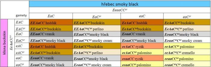 V případě spojení dvou koní „jedenkrát ředěných" se můžete dočkat nejen těchto barev, ale i pseudoalbínů či základních barev – jak znázorňuje následující paleta možných potomků ze spojení hřebce smoky black a klisny buckskin. „Náhodně" jsme zvolili genotypy v genech Extension a Agouti. Víme, že smoky black a buckskin nesou pouze jednu Cream alelu. Genotyp tedy musí být CCcr.