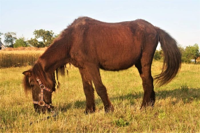 Zdravotní stav – kupovaná na jedno oko slepá, cca od 35 let se jí zhoršil zrak i v dříve zdravém oku, už i hůř slyší. Zuby má již špatné, pastvu zvládá, ale seno musí mít granulované. Jako příkrm dostává mačkaný oves, otruby, máčené vojtěškové granule a řepné řízky. K tomu na ochucení přidávám müsli – buď na přibrání od Koňské bylinky, nebo NovaEqui nebo Hippi Naturvit. Vždy to, co obsahuje pivovarské kvasnice a jablečné úsušky, někdy šípek. Do toho ostropestřecový olej a Artroregen sirup od Topvetu. Kyblík dostává ráno a večer, ale jak má horší zuby, stejně ten kýbl žmoulá víc jak hodinu – takže samozřejmě nemůže žrát se stádem, ale v klidu v soukromí.