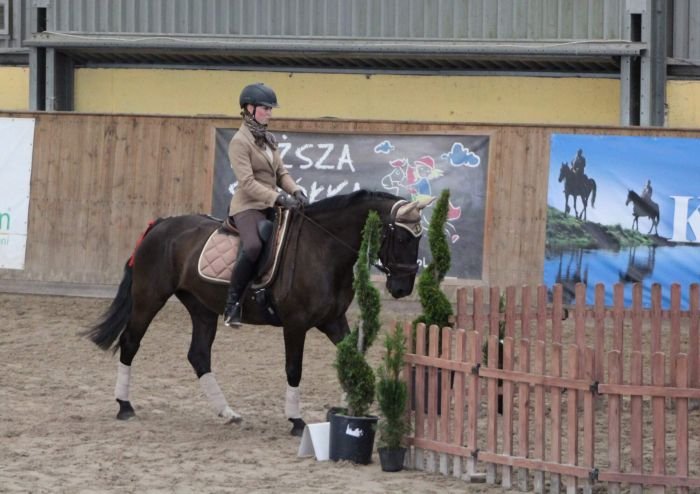 Velmi doporučuji nejprve si postavit pouze dva stojany ve vzdálenosti cca 2 m od sebe a projet si překážku “nanečisto” bez provazu, nejprve obouruč a pak s otěžemi v jedné ruce. Pokud si pak kůň u provazu není jistý, zkuste nejprve jezdit např. 8m kruh v kroku s vnější stranou koně co nejblíže k brance.