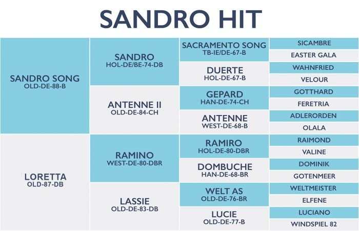 A když zkoumáme mateřské otce, Sandro Hit se sám objevuje u sedmi koní a jeho synové San Amour (z matky po Plaisir d’Amour), Stedinger (z matky po Landadel), Blue Hors Soprano (z matky po Contender) a Sungold (z matky po Grundstein II) mají po jednom potomku a Sir Donnerhall (z matky po Donnerhall) dva.