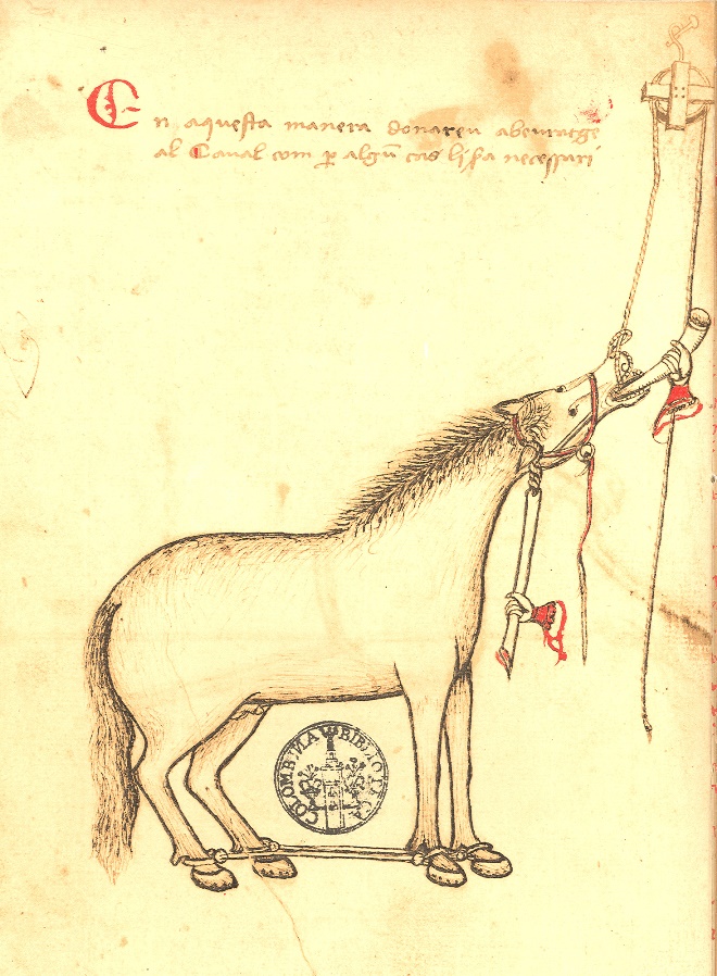 Nákres z poloviny 15. století, jak koni dostat do krku