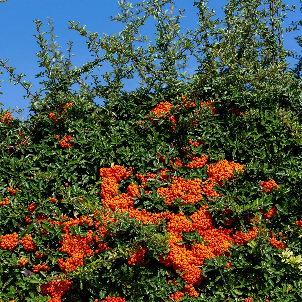 Hlohyně šarlatová (Pyracantha): Na dosah koní určitě ne. Sice mi ji nikdy neochutnali, ale trny má tato kráska pořádné. Toxicita uváděna pro koně mírná až střední. Velmi nepříjemná díky silné trnitosti, při střihu mívám šrámy i přes rukavice. Umí se, daří-li se jí na stanovišti, rychle rozrůstat. Její pořízení bych si už dnes velmi rozmyslela, stříhám ji dvakrát ročně, abych ji udržela trochu v mezích, a pomalu mě, i přes vzhledovou atraktivitu v zimě, přestává penzum práce s ní těšit. Ale zase drží dlouho do zimy plody, které svítí na neopadavých zelených listech jako žluté, oranžové nebo rudé korálky (dle odrůdy). Hlohyně je prostě krásná – a užitečná coby krmný keř pro ptactvo. Takže zatím u nás i přes všechny mínusy, mimo dosah koní, zůstává…