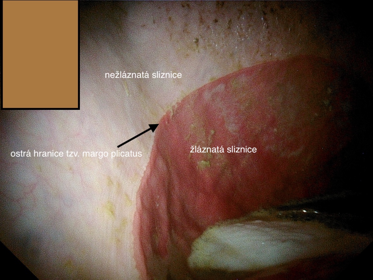 Obě části odděluje tzv. margo plicatus – ostrá linie, na které jsou rozdíly mezi sliznicemi krásně vidět při gastroskopii. Kolem marga plicata vzniká nejvíce vředů.
