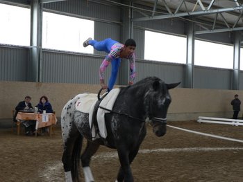 V soutěži paravoltiže koně chodí na lonži v kroku, závody integrovaných cvičenců se již jedou ve cvalu. Drásovští letos zapůjčili na závody kvalitní koně s dynamickým pohybem hřbetu a někteří závodníci měli co dělat, aby se vyrovnali s rytmem koně a tak nebyla nouze o ukázky letecké akrobacie.