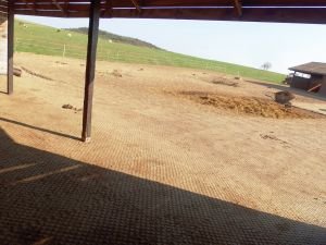 Nahoru se dá ještě vrstva písku, do které se již skládá dlažba. Ve finále se zasype jemným štěrkem. Znám ale i chovy, kde pokládali betonové zatravňováky přímo na hlínu, jen do minimální vrstvičky písku – a funguje jim to pod stádem zcela uspokojivě již léta.