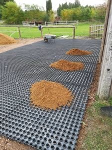 Mnohem běžnější jsou tzv. plastové rastry s otvory, které se dají zasypat směsí drobného štěrku a písku, případně přímo písčitější (propustnou) zeminou. Otvory časem prokoření tráva a zajistí tak ještě pevnější ukotvení rastru k podkladu. I zde se vyrábějí různé tloušťky, přičemž ke zvířatům je doporučováno použít dražší, vyšší varianty, vhodné k danému účelu. U koní jsem je již poměrně často viděla a koňáci si je velice chválí nejen do prostoru, ale i kolem krmelců. Každý výrobce ochotně poradí, který z jeho výrobků je ke koním nejvhodnější, většina se již s použitím například do paddocků a zimních výběhů setkala a s koňáky jako s odbytištěm již nějaký ten pátek počítají…