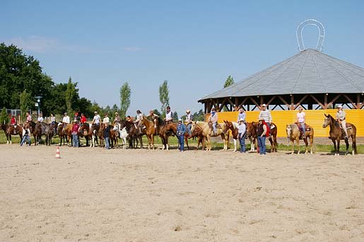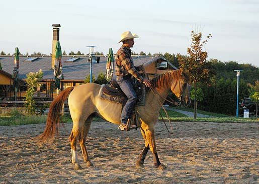 Jak už jsem řekl, pod sedlem se pracovalo podle úrovně přiježděnosti koní. Byl jsem ve skupině, kde se převážně cvičilo ovládání rychlosti, přesné a správné naskočení do cvalu a přesné vedení koně dvěma a jednou rukou a samozřejmě kontrola sedu.
