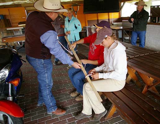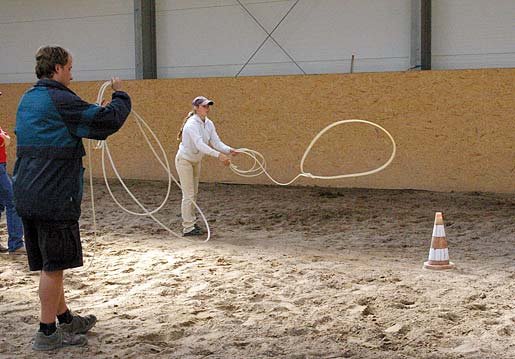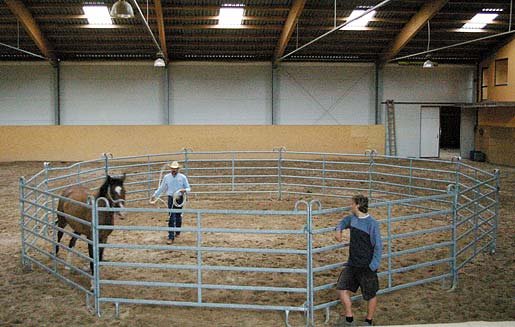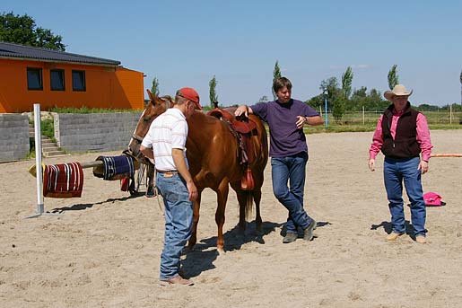 Jeden z prvních workshopů byl o sedlech (Obr.3.) a večerní pak o práci v kruhové ohradě, navázání komunikace s koněm a o komunikačních prostředcích, které používá kůň a které člověk. Tedy v kostce vlastně horsemanship. Oni to také tak běžně nazývají a nikdo to jako nějaké sprosté slovo necítí, což u nás se bohužel stává. (Obr.4.) K vyvíjení tlaku na koně používají vlastní tělo, laso, hlas a pohled.