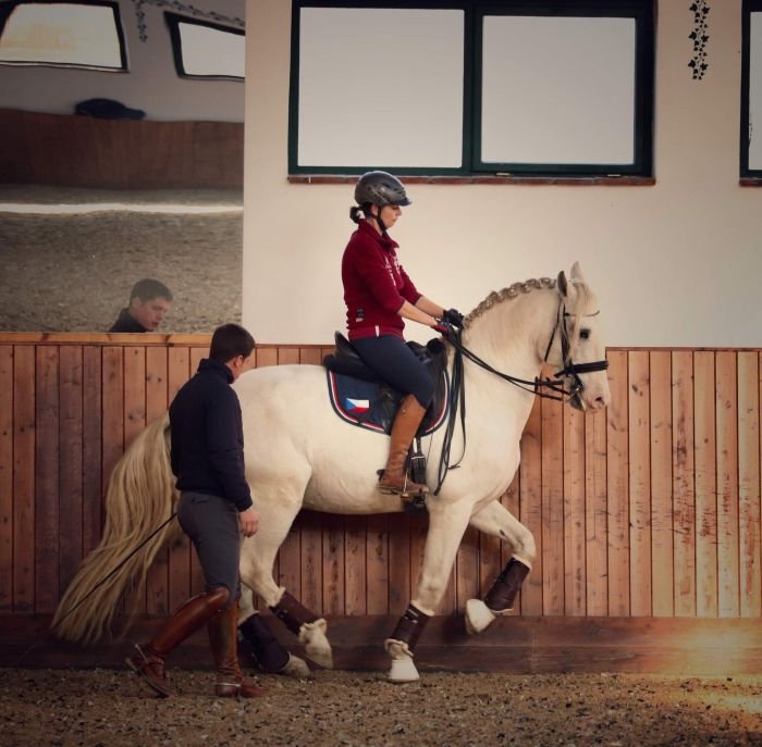 Začátky nebyly úplně jednoduché, protože mi najednou došlo, že mám hřebce a vůbec s tím nemám zkušenosti a ani obecně s tímto typem koní a strašně jsem se bála, že mi buď přeroste přes hlavu nebo že ho zkazím. A on byl sice na hřebce hrozně hodný, ale pořád puberťák, takže mi třeba při prvním vedení do výběhu zkusil skočit na záda. Tak jsem sháněla rady, kde se dalo, ale naštěstí jsem měla vždycky kliku, že jsem potkala lidi, co jsem v tu chvíli zrovna potřebovala.