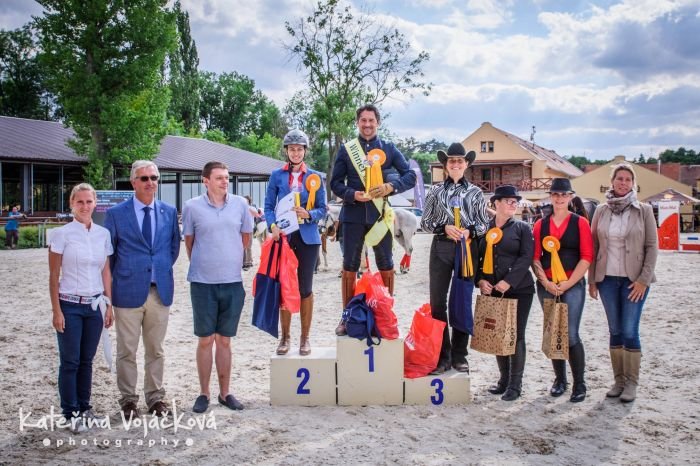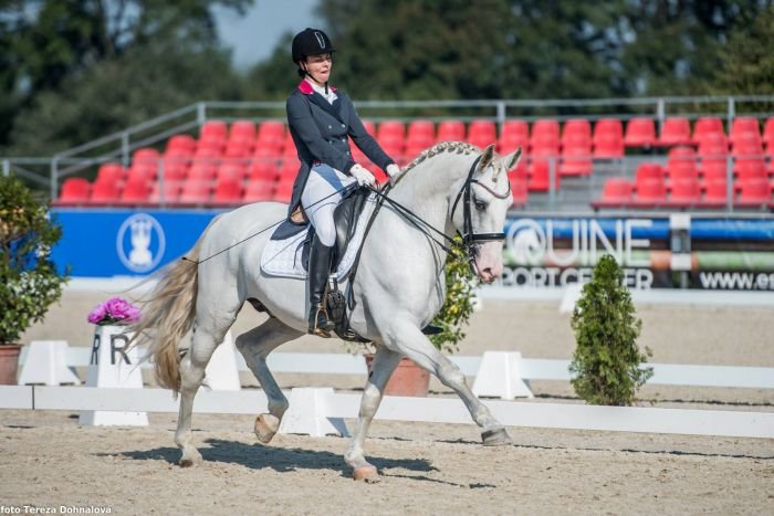 Kromě toho Míla i trochu skákal. Vždycky na jaře začal skokovou sezónu s Tomášem Hůlkou, pak jsme se věnovali drezuře a na podzim Working Equitation. Ale jak těch disciplín dělal Míla víc, tak nebylo možné tolik závodit, a tak jsme většinu úrovní trochu prosvištěli a šli dál. Určitě to není ideální přístup. V roce 2016 jsme splnili další cíl a zúčastnili se lusitánského šampionátu v Německu, kde byl Míla uchovněný a s Tomášem vybojoval krásné druhé místo ve skocích. Nakonec spolu skákali do 120 cm a myslím, že velmi dobře. Ale jak jsme se v drezuře dopracovali dál, už jsem se bála zranění, a tak jsem ho ze skákání stáhla, i když ho to moc bavilo. Teď, když jsme se dopracovali do Grand Prix, mě vlastně trochu děsí, že tady už musím zůstat. Ale já si zase najdu nějaké další výzvy. Gari Zoher mi říkal, že jezdit Grand Prix není těžké, ale že je těžké to jet bez uzdečky. Tak to máme jako další krok 🙂