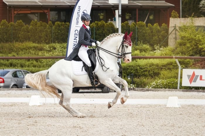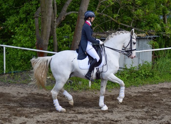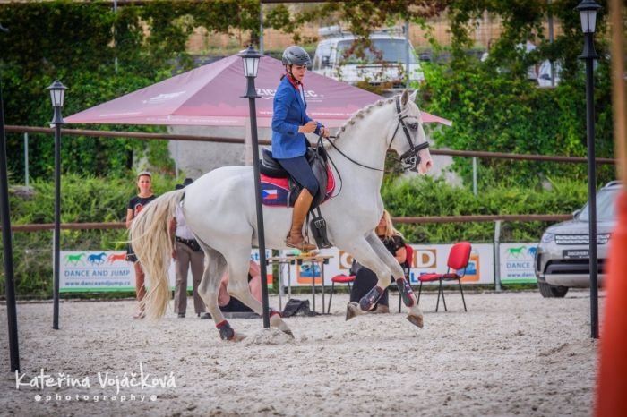 Nikdy jsem ten pocit neměla. Já jsem si vždycky uvědomovala svoje vlastní limity a tak mi nikdy nepřišlo, že bychom nedostali body proto, že není teplokrevník. Naopak bych řekla, že to má spoustu výhod. Je bílý, jiný než ostatní koně a navíc hřebec, co se rád předvádí. Má spoustu osobnosti a závody miluje. A je pohodlný a snadno jezditelný. Takže v zásadě si myslím, že jsem na tom mnohem lépe než jezdci na teplokrevnících. Někdy je moc temperamentní a pak dělá chyby, ale ty jdou pořád spíš za mnou. To já se musím pořád učit, jak závodit. A on je chytrý a učí se rychle. Samozřejmě nemá takové prodloužení jako moderní teplokrevní koně, ale pro ty je zase mnohem těžší se shromáždit nebo zkoordinovat svoje tělo.