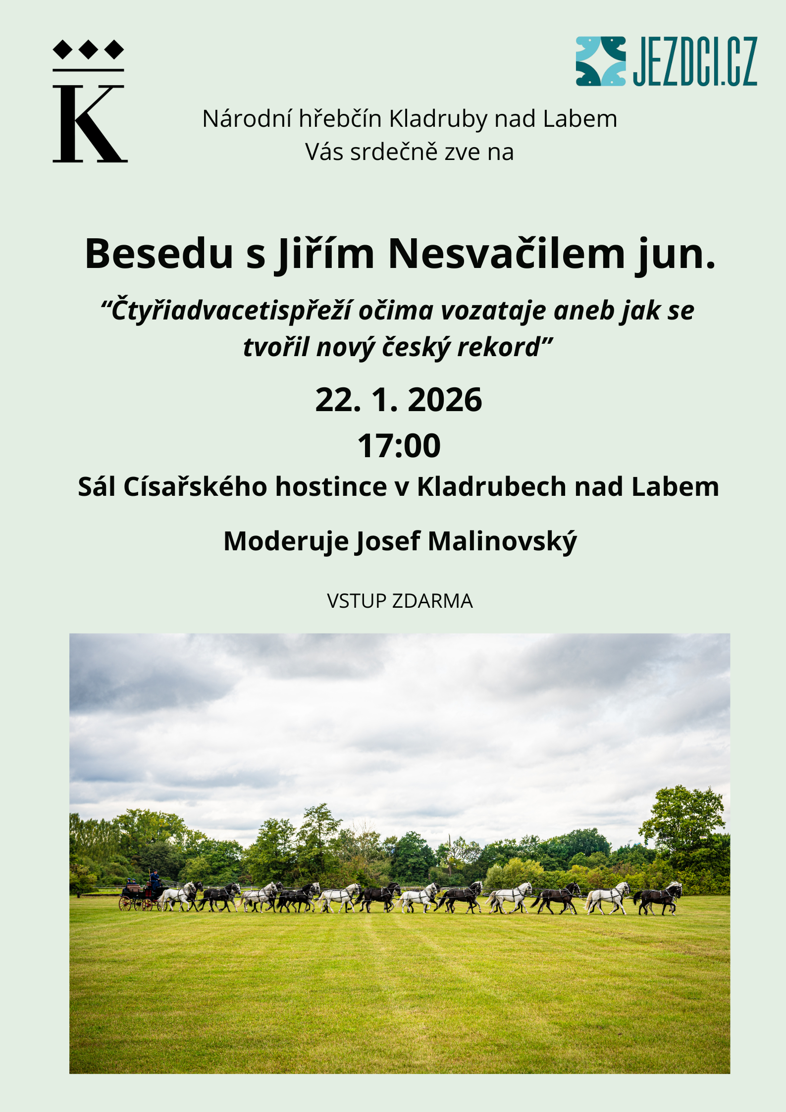 Chcete nahlédnout do zákulisí toho, jak se tvořil nový český rekord? Tuto jedinečnou možnost budete mít na besedě s Jiřím Nesvačilem jun., který vám přiblíží, jak probíhalo zapřahání čtyřiadvacetispřeží starokladrubských koní, a představí cestu, která vedla k tomuto mimořádnému úspěchu. Beseda se uskuteční 22. ledna od 17:00 v sále Císařského hostince v Kladrubech nad Labem.