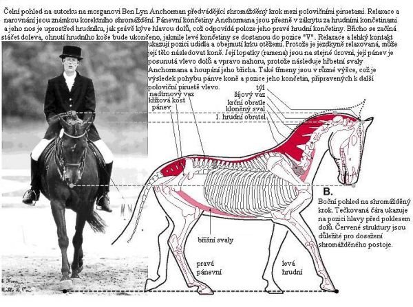 Snížený krk vyvolá napětí v oblasti hrudního koše: kůň jde z prvního obratle jakoby "z kohoutku nahoru". Pánev a sousední bederní páteř jsou snížené v L-S kloubu. Celá horní linie koně změnila polohu a směrem dozadu se svažuje (pocit jezdce, že kůň jde "do kopce"). |
