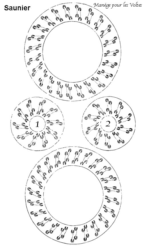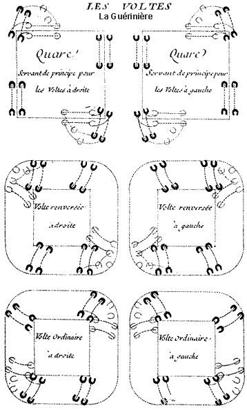 Nejdříve bych ráda ukázala dva příklady malých kruhů z klasických monografií La Guériniereho Ecole de Cavalerie: Tome Premier (1769) a Sauniereho L´Art de la Cavalerie. Gaspard de Saunier (1663 – 1748) a François Robichon de la Guériniere (? – 1751) používali různé jízdárenské figury kombinované s laterálními pohyby (čili práci na dvou stopách), aby zlepšili poddajnost, ohebnost a rovnováho koně. Kombinují se zde požadavky práce na malých kruzích a laterálních pohybů.