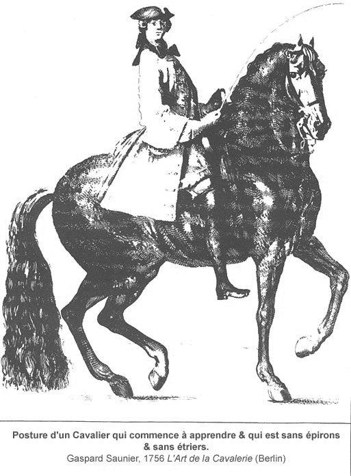 Jak ukazuje následující obrázek ze Saunierovy L´Art de la Cavalerie, klasický sed a relativní vzpřímení je trochu odlišné od moderní verze drezurního sedu. Saunier se cítil poněkud povznesen nad pozici jezdce a dával detailní instrukce ohledně výstroje a držení otěží. Jeho bič v levé ruce směřuje nahoru: