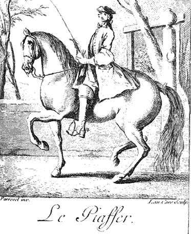 Pozice jezdce, výstroj a držení otěží je podobné Saunierovi, přestože jezdec používá třmeny a ostruhy. Bičík drží v pravé ruce otočený směrem nahoru. Přestože se nejedná o fotografii, krk koně na obrázku se zdá být poněkud delší, než na obrázku Sauniera, avšak podle jiných tělesných proporcí koně se může jednat o uměleckou zkratku. Podle pozice pánevních končetin kůň předvádí piafu.