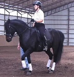 Na rozdíl od Saunierova jezdce balancuje na prstech svých nohou, aby odlehčila sed (což je u tohoto koně pomůcka pro piafu). Přestože kůň vykazuje menší relativní napřímení, než Saunierův model, je natažený tak, aby udržoval kontakt, má zvednutý kohoutek, akceptuje sedlo tím, že přizpůsobí zakřivení krku a hlavu umístí tak, že jeho nosní linie se blíží ke kolmici. Můj instruktor nemá bič, ale ukazuje na Maxův pravý kyčelní hrbol (což Maxe moc netěší, protože upřednostňuje absolutní minimum instrukcí).