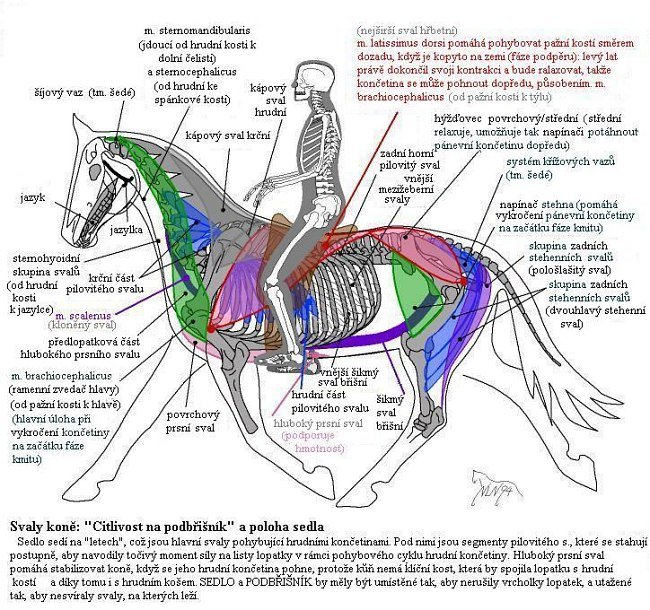 Sedlo položené příliš dopředu bude rušit listy lopatek, výsledkem je zkrácení pohybu hrudních končetin a může dokonce poranit nejširší hřbetní sval, jehož hlavní úlohou je tlačit tělo koně dopředu, když je hrudní končetina ve fázi podpěru (pozn. překl.: tedy "překlápět" tělo přes hrudní končetinu). Pokud je sedlo příliš vzadu, může dráždit bedra a posune hmotnost jezdce dozadu za nejstabilnější místo v oblouku páteře.