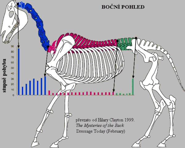 Graf ukazuje měření prováděná na kadáverech a používaná pro stanovení rozsahu pohybu (flexe = vyklenutí a extenze = prohnutí) páteře. Malá ohebnost mezi hrudními a bederními obratli však může v konečném důsledku vyprodukovat mnohem větší změnu polohy jednotlivých struktur ve směru zepředu dozadu. Je to díky tomu, že každý sebemenší pohyb v jednom kloubu změní trochu pozici jednoho obratle, což umožní mírný posun dalšímu obratli a tak to jde až k zádi. Tímto způsobem mohou jednotlivé části koňské páteře využívají výhod semirigidity (nesou hmotnost, přenášejí pohyb z končetin) a současně výhody flexibility (vyklenutí a ohýbání hřbetu, díky čemuž je kůň hbitý a pohyblivý). Převzato z: Hilary Clayton 1999 (February) The Mysteries of the Back, Dressage Today, str. 28 (Český překlad MVDr. Dominika Švehlová: Záhady koňského hřbetu).