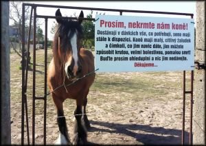 Přesto všichni doufáme, že žádný „boj“ nebude třeba. Že postačí osvěta, se kterou nám každý slušný člověk ochotně pomůže. Že se vy, kolemjdoucí, necháte právě v zájmu koní, kolem kterých s dětmi chodíte a můžete jim je zatím denně v rámci procházky v krajině ukazovat, pohnout ke slitování. Že přestanete nedovoleným krmením koním ubližovat…