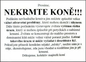 Maminky a tatínci s malými dětmi, pejskaři, procházkáři a důchodci – ti všichni s oblibou na svých cestách za vlastním zdravím a odpočinkem ohrožují s klidem a úsměvem zdraví cizí, to koňské. Bohužel si většinou neuvědomují rizika, které podání i jediného jablka, kousku chleba nebo i obyčejné trávy od cesty může způsobit. Protože prostě NEJSOU JEDINÍ, kdo jde za den kolem a pociťuje potřebu do ohrady něco dobrého hodit – a to nemluvím o kategorii lidí, kteří sice o následcích překrmených zvířat velmi dobře slyšeli (koneckonců přečíst si zákazové cedulky na ohradách zvládne každý…), ale rozhodli se je ignorovat, protože oni přece dají „jen jedno jediné jablíčko a jeden jediný kousek rohlíku, to neublíží“! Ovšem faktem, že jsou ten den již dvacátými kolemjdoucími s podobným uvažováním (a kdo ví, kolik jich ještě bude po nich) se již nezaobírají… 🙁