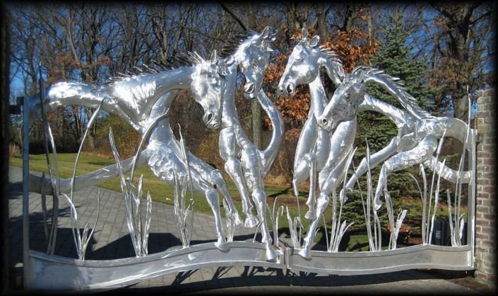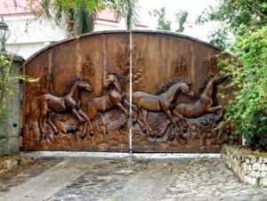 Ani absence vlastního statku neznamená, že si nemůžete, coby koňák tělem duší, udělat radost – pořiďte si na zahrádku nebo jako vstupní dveře do domu nějaký opravdu propracovaný kousek s koňotematikou…