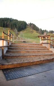 Jelikož praxe ukazuje, že zpevnění delších prudších svahů zátěžovými rohožemi (viz foto) zvířatům v mokrá a mrazivá období velmi klouže a mnoho chovatelů hlásí toto řešení jako nepraktické až přímo nebezpečné (hlavně na delších úsecích), nezbývá, než se zaměřit na úpravu pomocí teras/schodů.