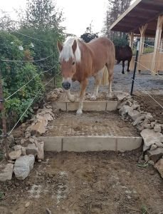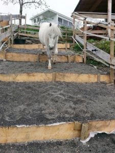 „Schody naši koně mají cca 7 let… dělali jsme je rok poté, co jsme si přivezli koně domů na velmi kopcovitý pozemek. První rok bez schodů byl tento kopec nepříjemný až nebezpečný, doslova skluzavka. Pro lidi i pro koně. Takže zkusit vybudovat schody byla naprostá nutnost.