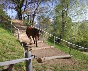 Jelikož praxe ukazuje, že zpevnění delších prudších svahů zátěžovými rohožemi (viz foto) zvířatům v mokrá a mrazivá období velmi klouže a mnoho chovatelů hlásí toto řešení jako nepraktické až přímo nebezpečné (hlavně na delších úsecích), nezbývá, než se zaměřit na úpravu pomocí teras/schodů.