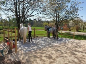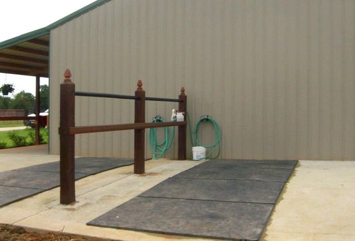 Zpevněná plocha uvaziště je nutností. Ať už zvolíme štěrk, dusaný písek, zátěžové rohože nebo beton, vždy myslíme na vhodné vyspádování buď přímo k odtokové jímce (v případě, že uvaziště kombinujeme s mycím místem), nebo alespoň do té strany, kde je nejmenší provoz lidí a koní.