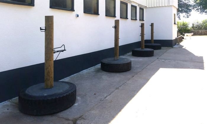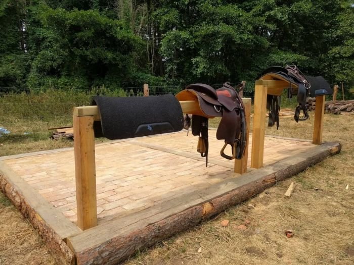 Pneumatiky zalité betonem se zapuštěnou stojinou, na kterou lze umístit sedlo a uzdečku. K takto řešenému uvazišti (potenciálně přemístitelný předmět) NIKDY koně neuvazujeme napevno, ale pouze na omotané vodítko tak, aby při minimálním problému kůň bezpečně opouštěl stanoviště – bez stojanu za sebou… 🙂