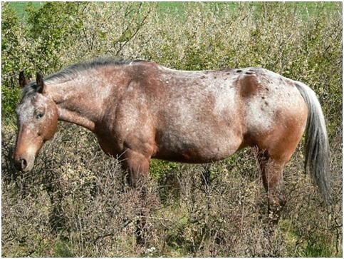 Roan blanket – Kůň se vzorem blanket a prokvétáním (varnish roan) v oblasti původní tmavé srsti.