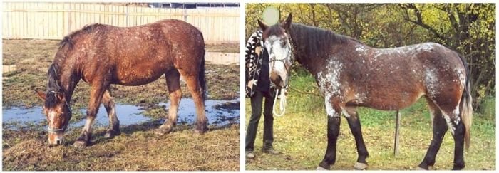 Varnish roan: tři fotografie znázorňují postupné vybělování jedné klisny: 1,2 (foto: archiv Ing. Barbory Sedláčkové)