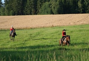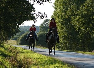 Trochu se ochladilo, koně spokojeně pofrkávají, přejíždíme z luk na silnice a zpět a trochu zvolňujeme tempo abychom měli dost sil na závěr cesty, která vede lesem do příkřejšího kopce. Konečně je v dáli vidět náš cíl, Františkov.