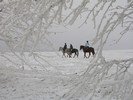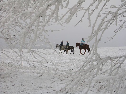 H. Görnerová: Tenhle záběr si přímo říká o úplně jiný výřez – dvě "díry" v průhledu mu uškodily. I tak se jedná o hezké vyjádření tématu, koně pěkně šlapou, jezdci rozmlouvají, prostě chvíle klidu a pohody. Dovolila jsem si pod hodnocením se snímkem trochu zalaborovat a oříznout jinak, posuďte sami.