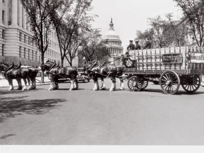 Až v roce 1933 se v kongresu vylíhl 21. dodatek ústavy – kterým se rušil 18. dodatek… Výroba piva a vína se mohla rozjet naplno, státní kasu mohly začít plnit daně. Anheuser a Busch třinácti suchými lety obratně propluli, nicméně konec prohibice byl pádným důvodem k oslavě. Když oslava, tak dar, a pořádný. Jednoho dne Adolphus Bush jr. řekl otci, jestli by se nešel podívat ven na nové auto. Když Bush vyšel před dům, místo Modelu T hleděl na šest ohromných koní zapřažených v červeno-bílo-zlatém voze s pivem. Bushovi synové jako připomínku první láhve piva po ukončení prohibice svému otci darovali šestispřeží clydesdaleských koní. Celou rodinu to dojalo natolik, že se od té doby datuje spojení „brečet do piva“.
