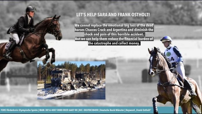 Úspěšná švédská jezdkyně všestrannosti Sara Algotsson Ostholt přišla při požáru přívěsu, který v pár minutách shořel, o svého koně Chacco’s Crack (Chacco’s Son x Lando). Desetiletá Arpertina (Arpeggio x Potsdam NRW) díky enormnímu úsilí veterinářů přežila a zprávy původně zněly velmi optimisticky, nakonec však byla o týden později utracena také. Rutinní odjezd ze závodů v polských Sopotách se tak kvůli technické závadě změnil v nejhorší noční můru každého člověka a se smutným koncem. Förderkreis Olympische Reiterspiele e.V. vypsalo sbírku a přispět může každý. Sara Algotsson Ostholt byla stříbrná v jednotlivcích na OH 2012 v Londýně ve všestrannosti s Wegou a je vdaná za německého jezdce všestrannosti Franka Ostholta, který vyhrál na OH v Hong Kongu 2008 týmovou zlatou medaili s koněm Mr. Medicott. Společně mají dvě děti.