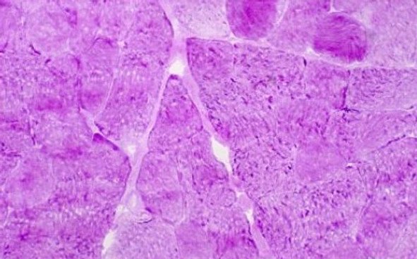 Obrázek vlevo: Biopsie svalu koně postiženého PSSM2, všimněte si svalového poškození