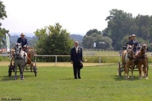 V bohatém nedělním programu byl vyhrazen prostor také drivingovým třídám. Těch měli diváci možnost vidět hned několik. Nejprve přišla na řadu otevřená zápřahová třída pro pony s KVH do 137 cm, kde se nám představila tři krásná spřežení. Pan Megens má vlastní bohaté zkušenosti z drivingových tříd, speciálně ze tříd harness, neboť je čtyřnásobným holandským harness šampionem s WMP hřebcem Bas. Od soutěžících očekával, že mu předvedou krásné poníky s vynikajícím pohybem a jeho očekávání se zcela naplnila. Tato kritéria v očích pana posuzovatele beze zbytku splnil plemenný hřebec Trawel Artuš (hřebčín Trawel Štichovice), kterého předváděl pan Pavel Blažek a ten si také dojel pro vítězství. Kromě krásné mechaniky pohybu pan Megens ocenil u Artuše i velmi dobrý typ a korektní předvedení. Doporučil by pouze upravit délku zádržného řemenu.