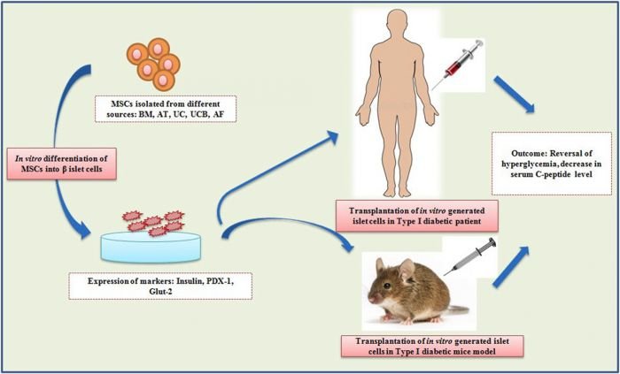 Bylo zjištěno, že podávání MSCs diabetikům obnovuje normoglykémii na preklinické i klinické úrovni. Mechanismus podílející se na terapeutických výhodách MSCs však stále není plně objasněn. Transdiferenciace, imunomodulace, prevence apoptózy a indukce diferenciace implikují regenerační potenciál MSCs. Bylo zjištěno, že in vitro MSCs izolované z různých zdrojů se diferencují na β buňky a po transplantaci obnovují normoglykémii. Diferenciaci těchto buněk na β buňky in vivo vědci stále vidí skepticky vzhledem k velmi nízké úrovni funkční integrace transplantovaných buněk do pankreatu.
