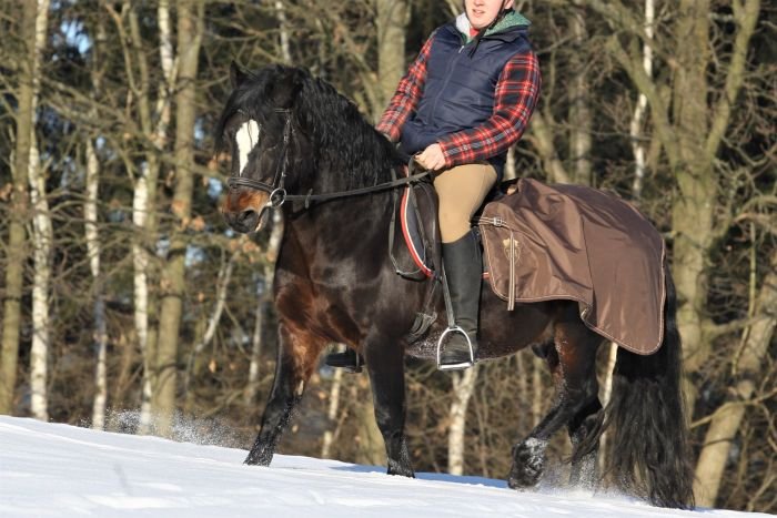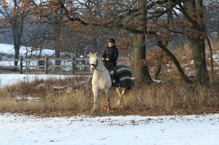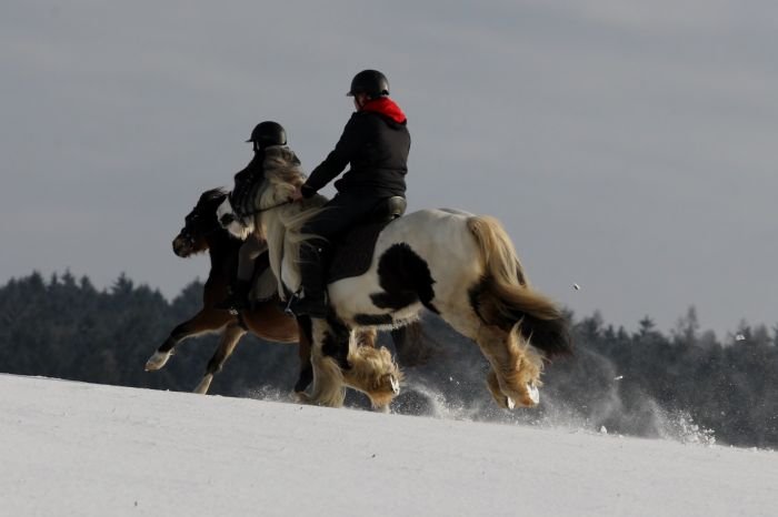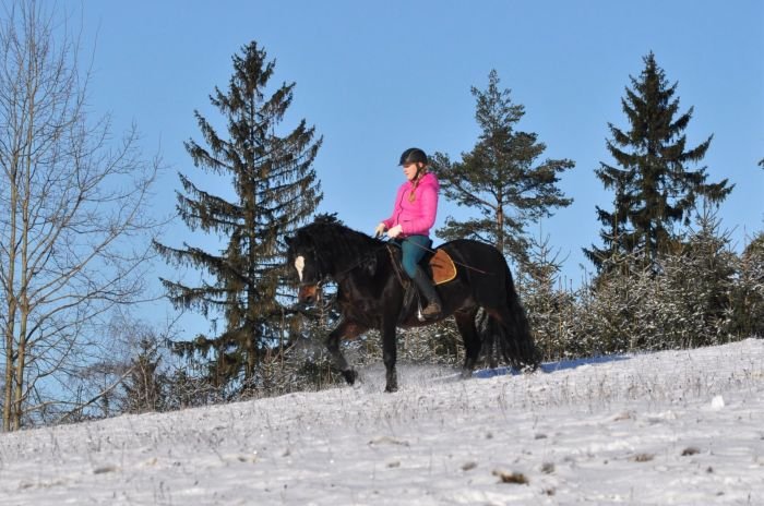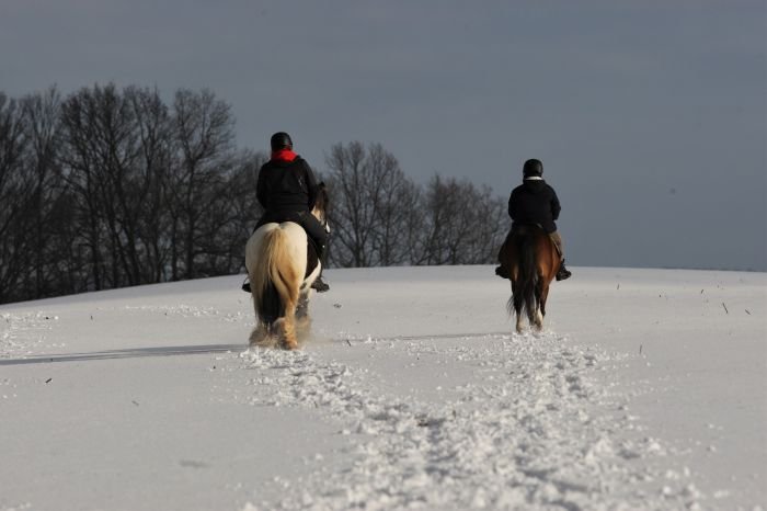 Led a sníh jsou pak kapitoly samy o sobě. Zledovatělým povrchům se zásadně vyhýbáme, protože pád může přijít i na rovině. I sníh může být nebezpečný, takže i tady ponechte raději romantické představy lehce stranou. Velmi záleží na kvalitě a stáří sněhu a dlouhodobých průměrných teplotách. Pokud je vrstva sněhu skutečně silná, má kvalitu prašanu a povrch pod ním je pevný, je pohyb sice náročný, ale poměrně bezpečný. V úvahu je nutné vzít zvýšenou námahu, která s pohybem ve sněhu souvisí. Větší sklon kopce + více než 30 centimetrů sněhu = maximální možná námaha. Pokud není vrstva sněhu dostatečně silná nebo sníh napadal na měkké podloží, neriskujeme a prudkému stoupání se vyhýbáme. Jestliže se po oblevě na vyšší vrstvě sněhu vytvoří silná ledová krusta, pak sněhem již nejezdíme. Vždy je také důležité vědět, co přesně sníh zasypal (kameny, klády, ledové plochy), což v neznámém terénu jezdec ani kůň nevědí. V hlubokém sněhu se tedy také držíme jen dobře známých lokalit.
