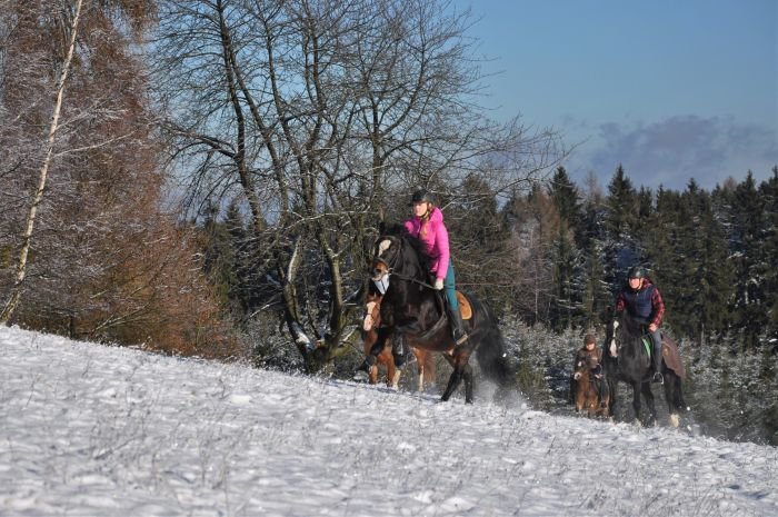 S širokou dostupností jezdeckého sportu i koní samotných ale dnes není výjimkou, že se v terénu ocitají i jezdci nezkušení, kteří z neznalosti trénují nevhodným způsobem, koně přetěžují a ohrožují jejich zdraví. I taková „zdánlivá“ maličkost, jako je jízda do kopce a z kopce, totiž má svá pravidla a totéž se týká i metodiky navyšování objemu práce v tréninku. Práce v různorodém kopcovitém terénu je ale skutečně mimořádně přínosná jak pro fyzické a psychické zdraví koně, tak i pro rozvoj sedu a rovnováhy jezdce. Proto i pokročilejší začátečník – jezdec i kůň – rozhodně do terénu patří. Jízdárna je grunt, terén špunt! 🙂 Jen musíme vědět, jak na to!