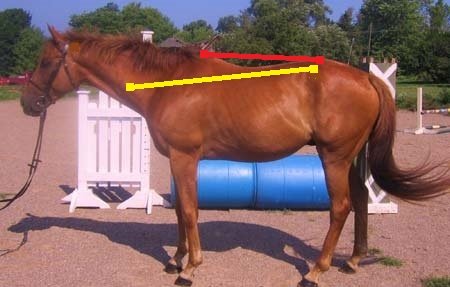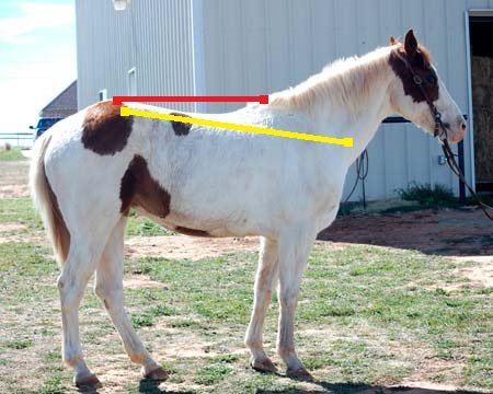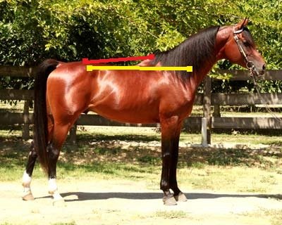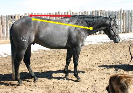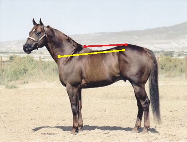 Vidíme, že tento kůň je stavěný trochu z kopce jak „starým" způsobem měření (kohoutek versus záď), ale i tím novým (kdy se díváme na páteř).