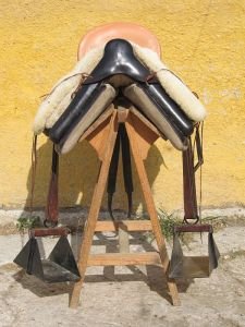 Také sedlo a třmeny dávají jezdci jiný sed a jinou rovnováhu než anglické sedlo. Zadním hrotem třmenu se i pobízí, takže jezdec je vlastně nucen dávat patu nahoru nebo minimálně je mu znemožněno jezdit se špičkou u koně. Mnoho španělských drezurních jezdců takto začínalo a dodnes je to na jejich stylu znát. Co se v mládí naučíš… 😉