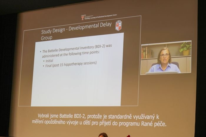Velmi zajímavým oborem v hiporehabilitaci je logopedie a na konferenci jsme viděli dvě prezentace. Všimli jste si někdy, jak se děti na koni pěkně rozmluví? A odborník v logopedii dokáže využít koně cíleně. Charismatická Beth Macauley, Ph.D., z USA na poslední prezentaci Hipoterapie v logopedii v hale Královického Dvora názorně předvedla, jak se dá spojit kůň a logopedie. Tlumočnice musely nejen překládat, ale i různými způsoby artikulovat, nicméně se svého úkolu zhostily na jedničku, jako ostatně během celé konference. To je obor, kterým se u nás zabývají především ve středisku Horticon, z.s. Jaký přínos pro ně měla v tomto ohledu konference? Na to mi odpověděla předsedkyně Horticonu, Mgr. Lucie Hovorková: „Byla založena mezinárodní skupina zabývající se využitím hiporehabilitace v logopedii a za Českou republiku nás bude zastupovat právě Mgr. Viola Jónová z Horticonu. S Beth jsme si popovídali po její úžasné prezentaci a byla velmi srdečná. Domluvili jsme se předběžně na další spolupráci a budeme zatím v online kontaktu. Jsme rády, že se potvrdily naše poznatky o spojení logopedie a hiporehabilitace, které jsme získali především naší praxí v ČR. Podobně to vnímají i v USA nebo v Polsku, odkud byla druhá zahraniční kolegyně Joanna Dzwonkowska.“